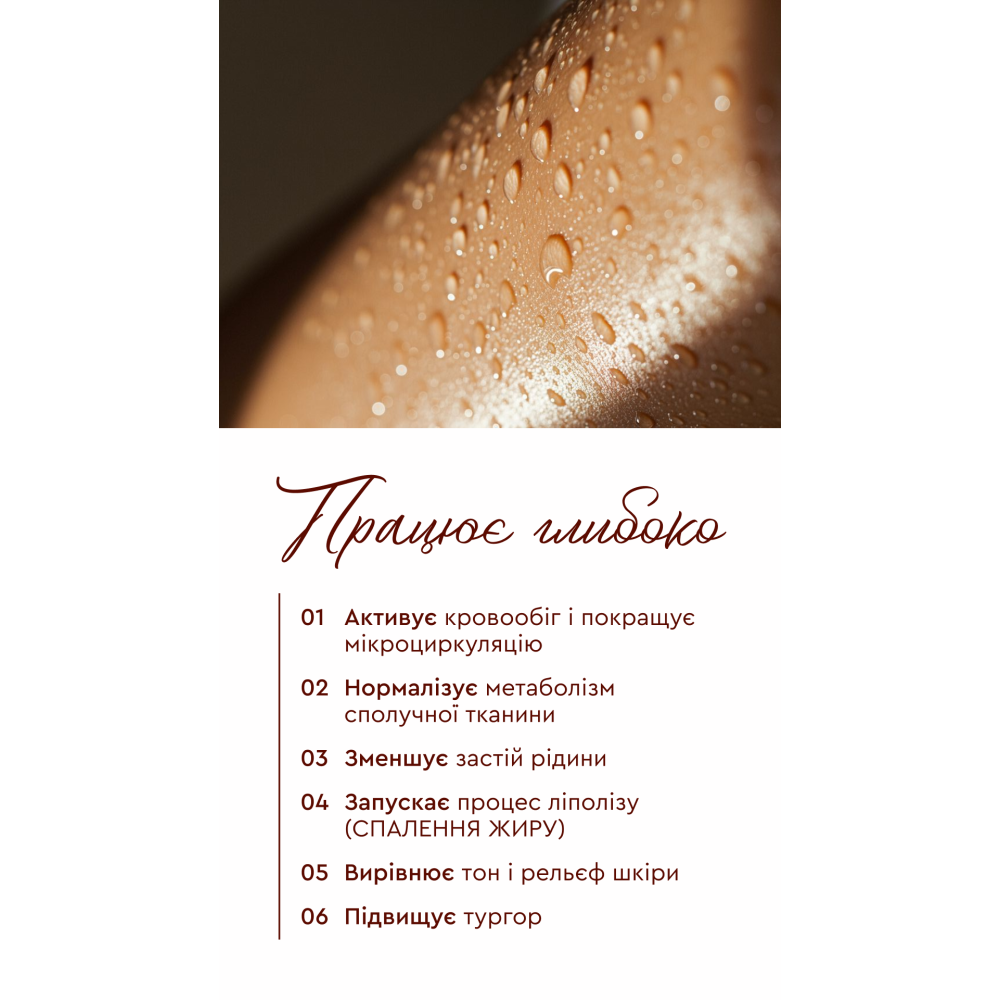 Антицелюлітний скраб з розігрівальним ефектом активує мікроциркуляцію, посилює лімфодренаж і запускає процеси ліполізу. Завдяки концентрованій формулі скраб від целюліту працює вже після перших процедур.