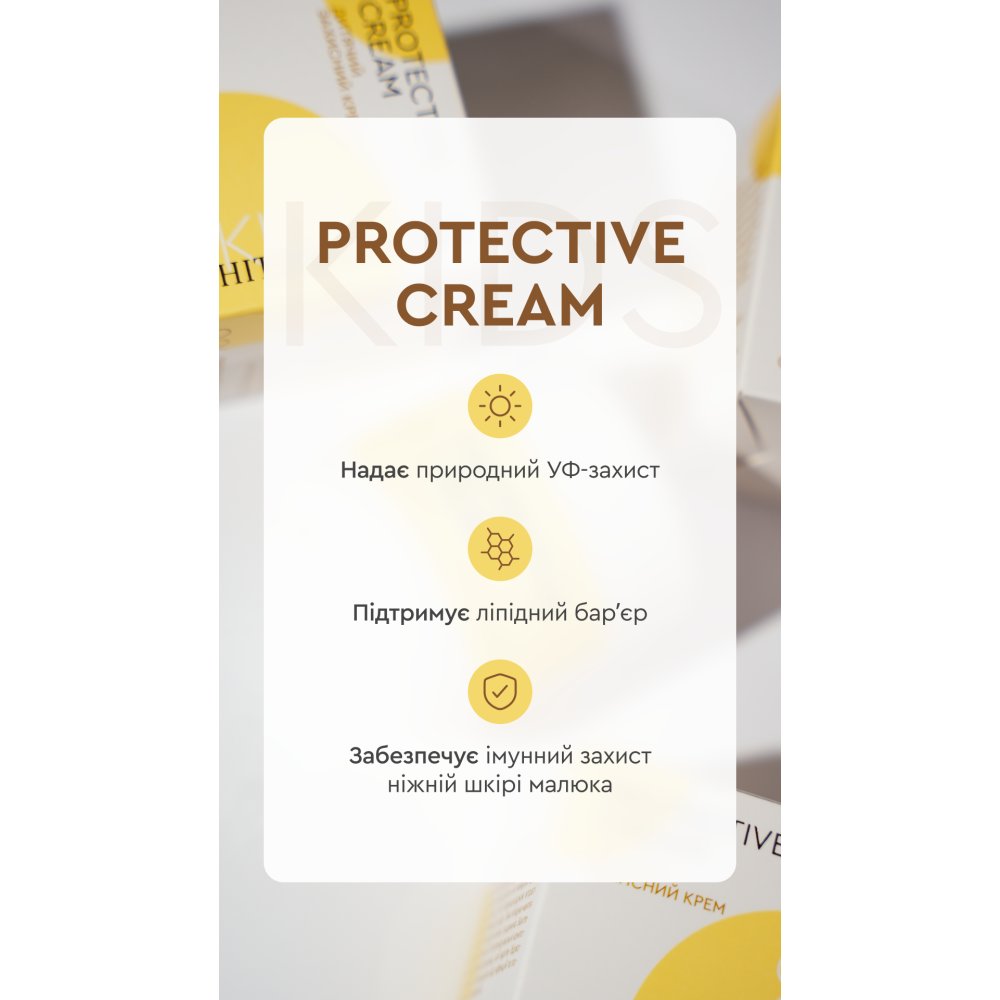 Дитячий захисний крем від негоди — це щоденний турботливий догляд за ніжною шкірою дитини в умовах холоду, вітру, морозу та перепадів температур. Крем розроблений спеціально для захисту чутливої дитячої шкіри та може використовуватися з перших років життя.